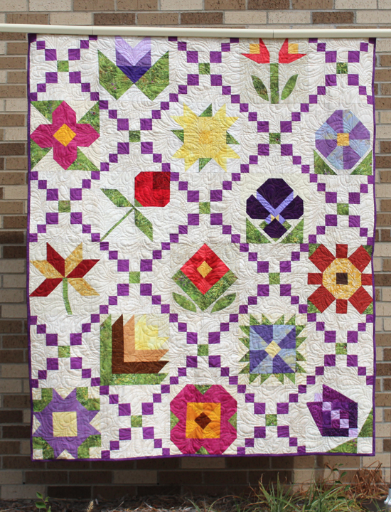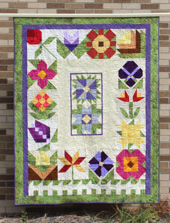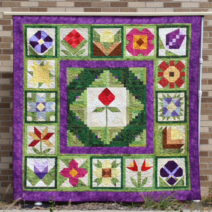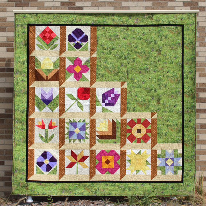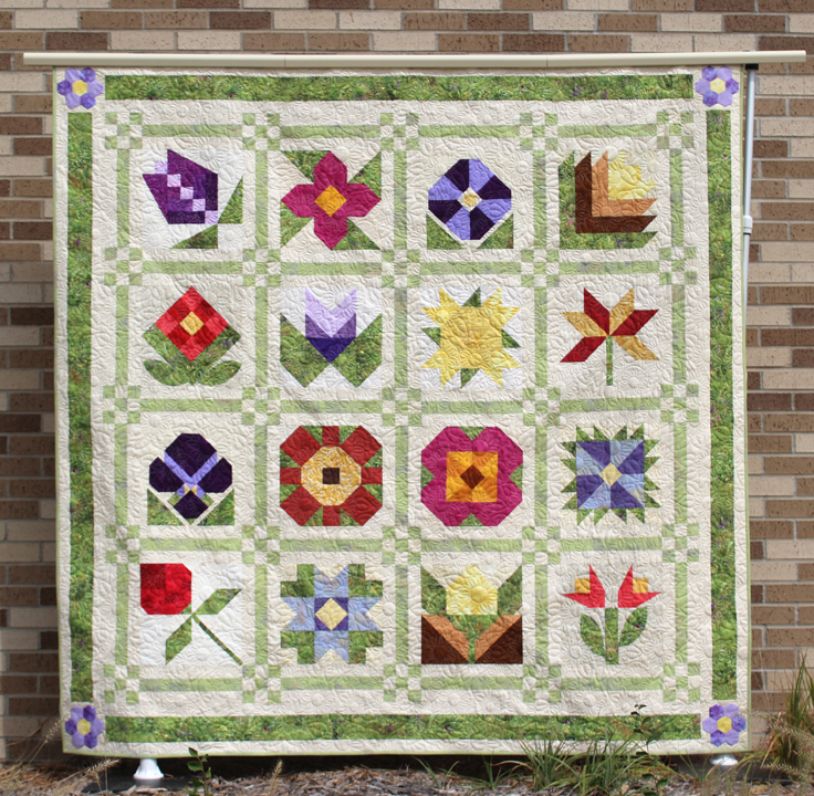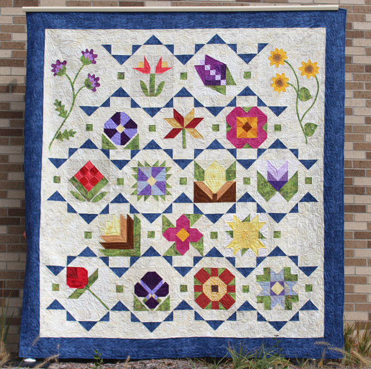 This page features the 2017 Quilted Garden quilts made from each participating shop. Unique Sampler Quilt made using a specially chosen palette of beautiful cotton prints and Exclusive Fabric. It's amazing how each shop's quilt is so unique, especially when you realize they have not seen each other's quilts until the day of the photoshoot.